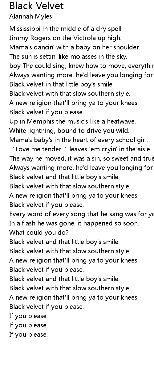 | [00:55.36] | Black velvet in that little boy's smile. |