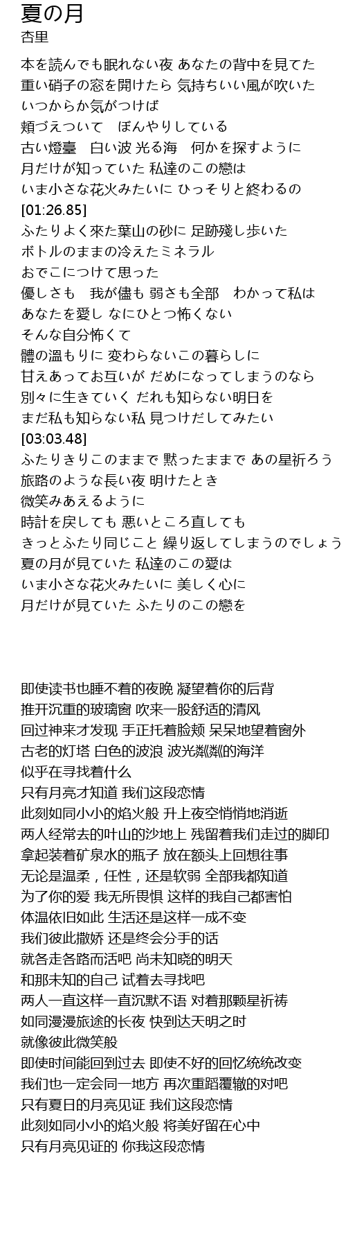 | [04:31.46] | 月だけが見ていた ふたりのこの戀を |