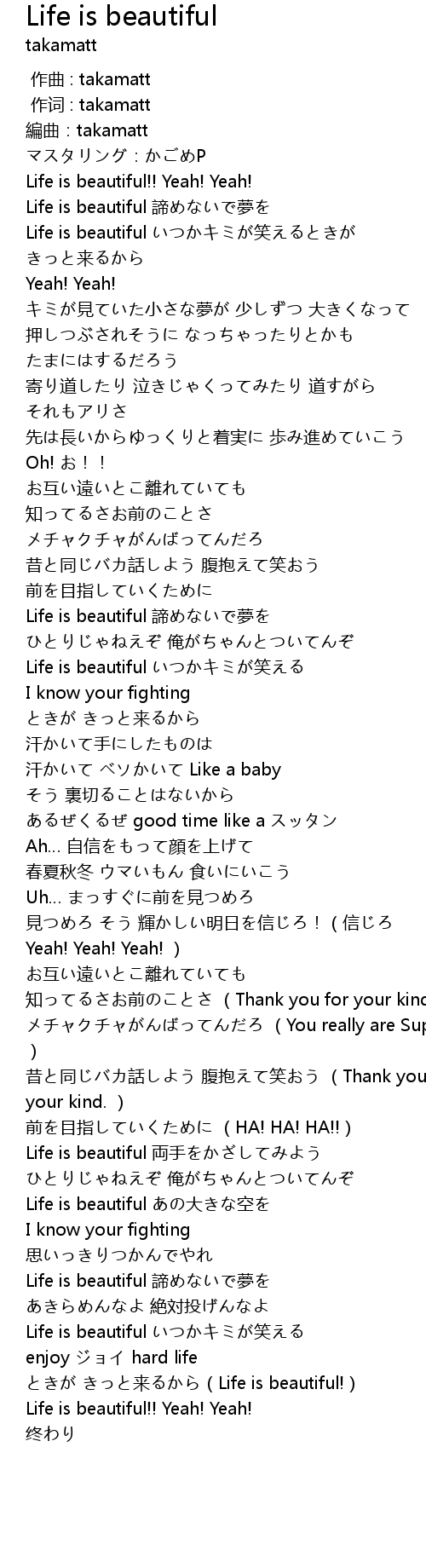 | [00:13.79] | Life is beautiful!! Yeah! Yeah! |