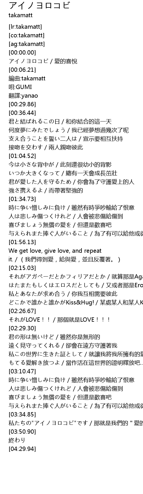 | [03:37.33] | 私たちの"アイノヨロコビ"です/那就是我們的"愛的喜悅" |