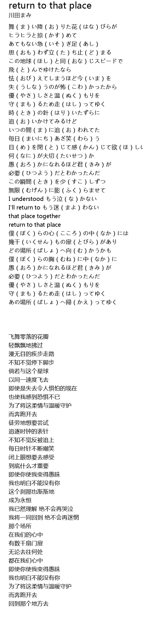 | [04:12.917] | あの場所(ばしょ)へ帰(かえ)ってゆく |