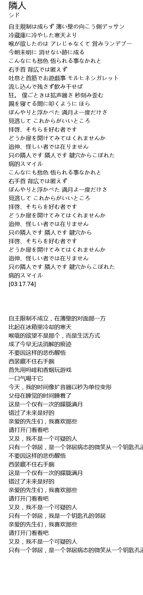 | [01:40.16] | 只の隣人です 隣人です 鍵穴からこぼれた 病的スマイル |