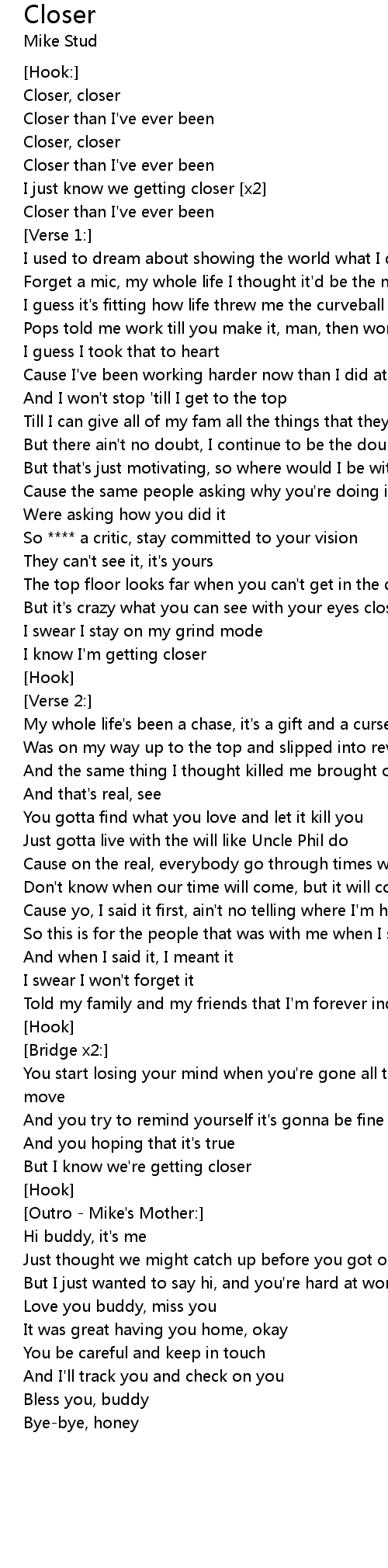 | I just know we getting closer [x2] | |