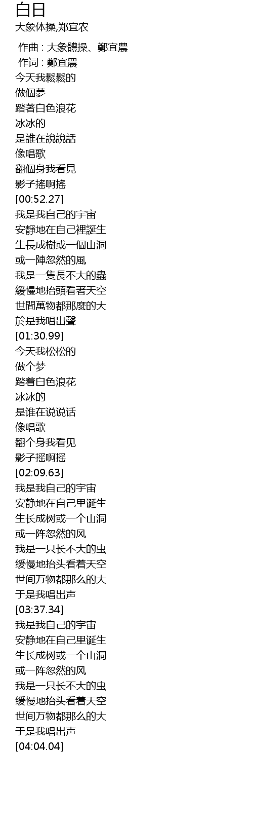 | [00:00.00] | 作曲 : 大象體操、鄭宜農 |