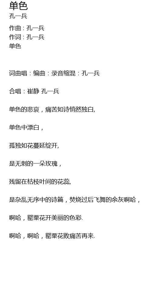 | 词曲唱:编曲:录音缩混:孔一兵 | |