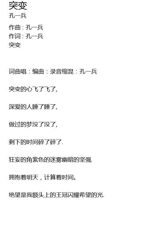 | 词曲唱:编曲:录音缩混:孔一兵 | |