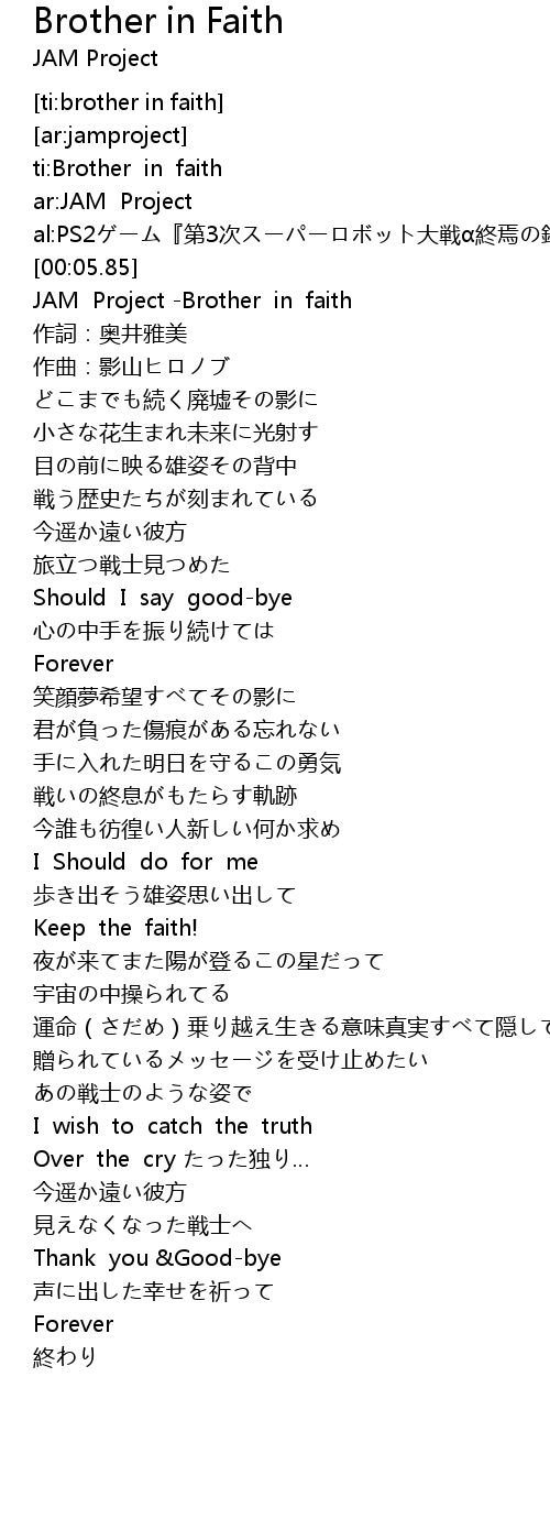 | [00:01.92]al:PS2ゲーム『第3次スーパーロボット大戦α終焉の銀河へ』ED] | |