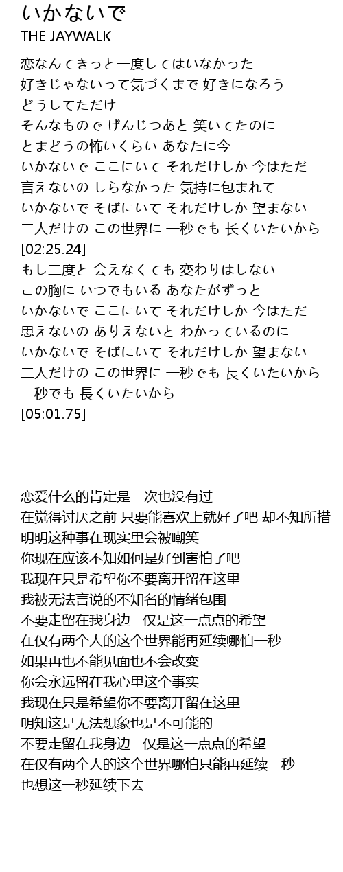 | [01:54.22] | いかないで そばにいて それだけしか 望まない |