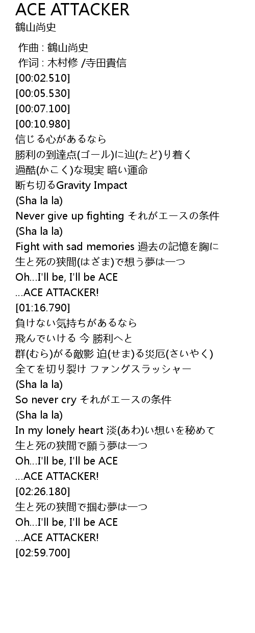 | [01:55.240] | So never cry それがエースの条件 |