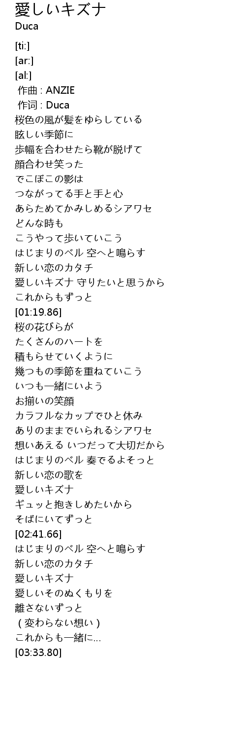 | [01:10.12] | 愛しいキズナ 守りたいと思うから |