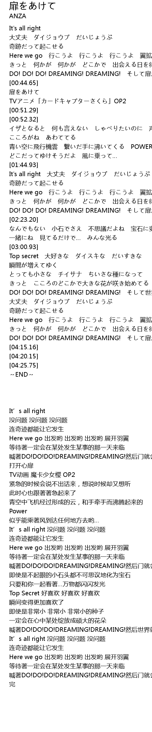 | [04:01.38] | 喊著DO!DO!DO!DREAMING!DREAMING!然后门就会打开了哟! |