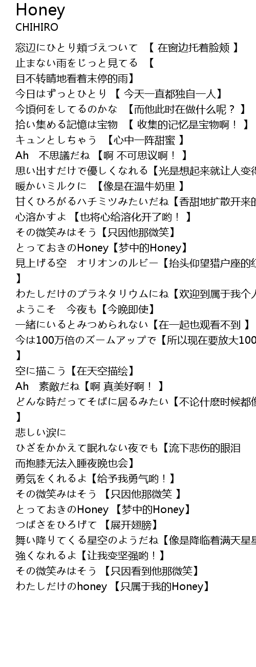 | [01:13.10] | 甘くひろがるハチミツみたいだね【香甜地扩散开来的蜂蜜啊!】 |