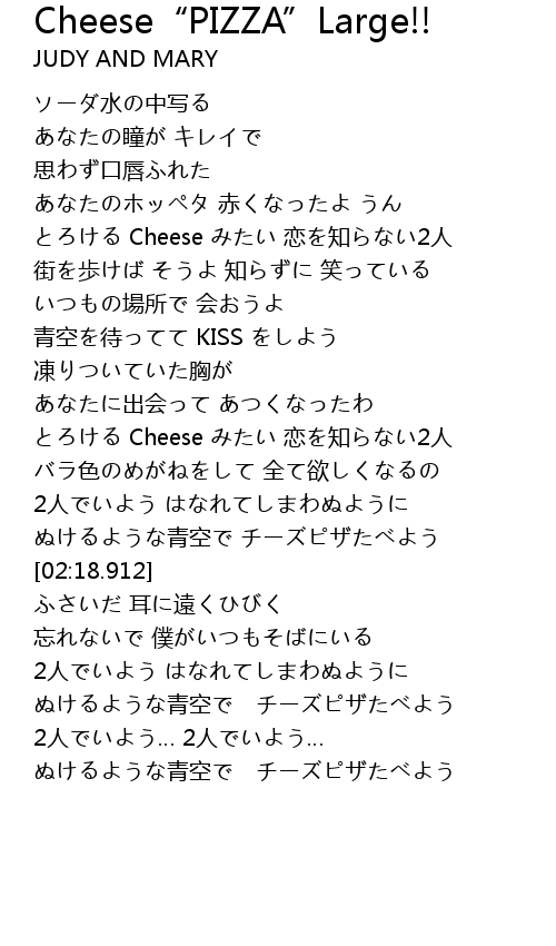 | [01:32.758] | とろける Cheese みたい 恋を知らない2人 |