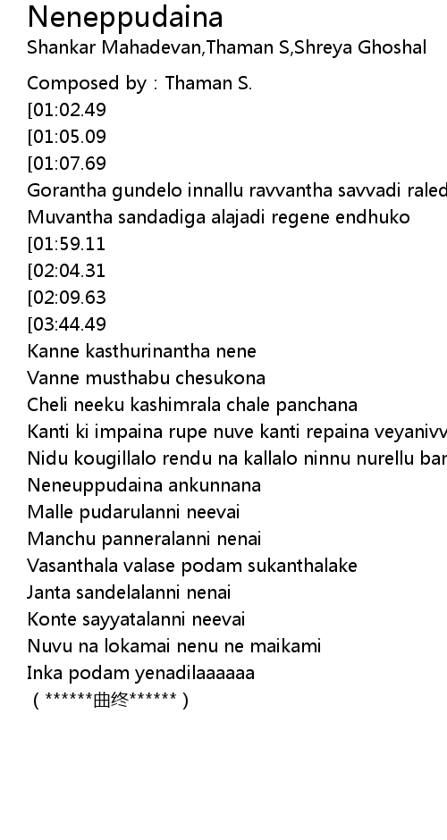 | [00:51.49][02:04.31][03:22.64] | Manasu mansu murise maduvai pedave thadise |