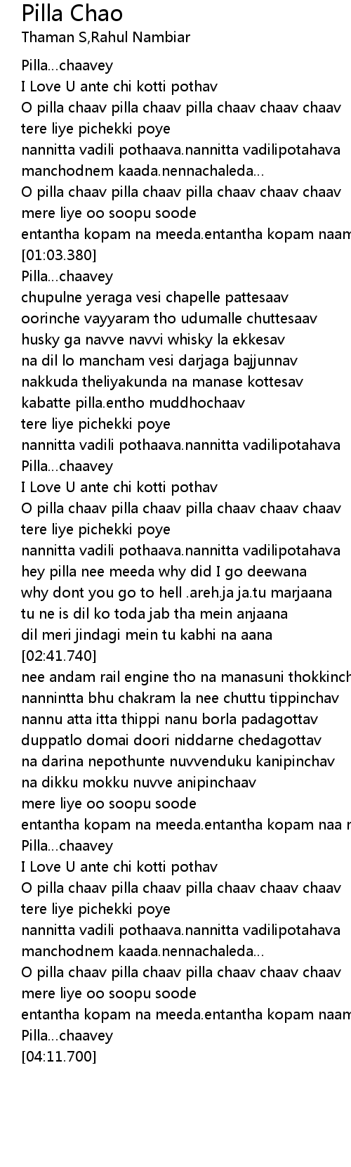 | [03:34.060] | O pilla chaav pilla chaav pilla chaav chaav chaav |