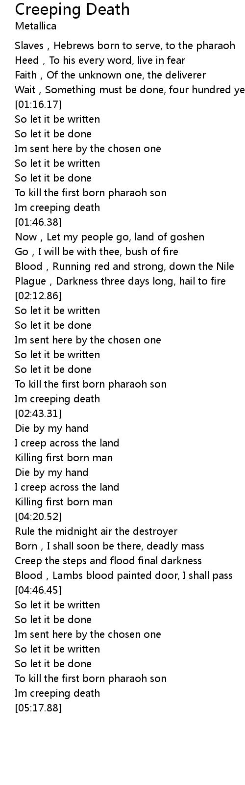 | [00:56.89] | Slaves,Hebrews born to serve, to the pharaoh |
