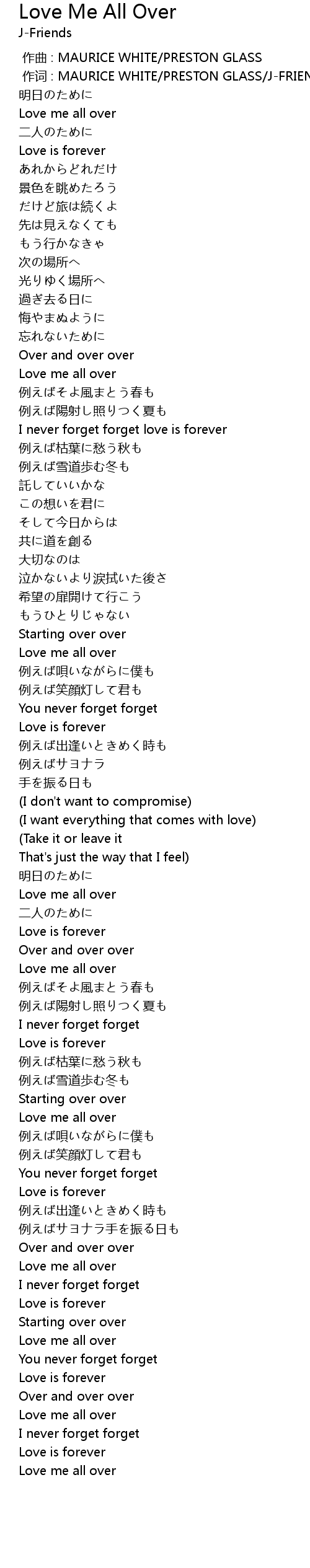 | [00:01.00] | 作词 : MAURICE WHITE/PRESTON GLASS/J-FRIENDS |
