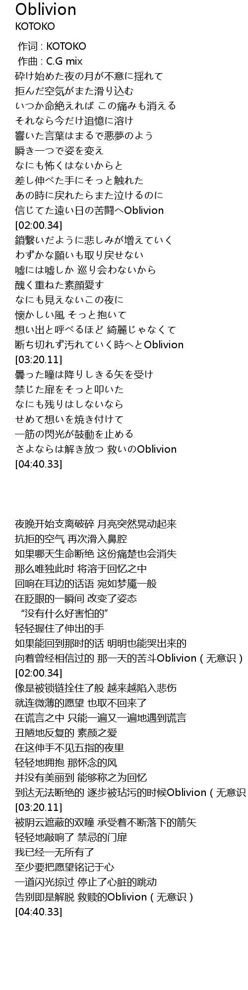 | [03:11.32] | 到达无法断绝的 逐步被玷污的时候Oblivion(无意识) |