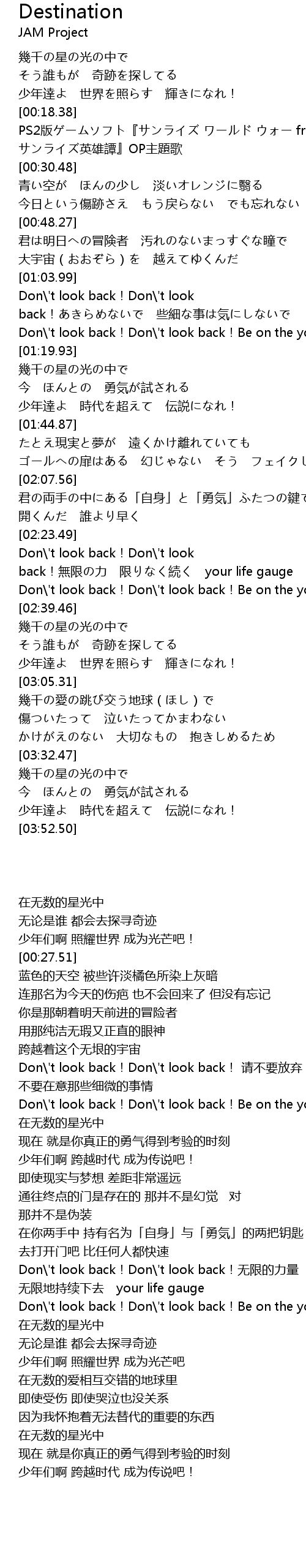 | [02:23.81] | Don' t look back! Don' t look back! wú xiàn lì xiàn xu your life gauge |