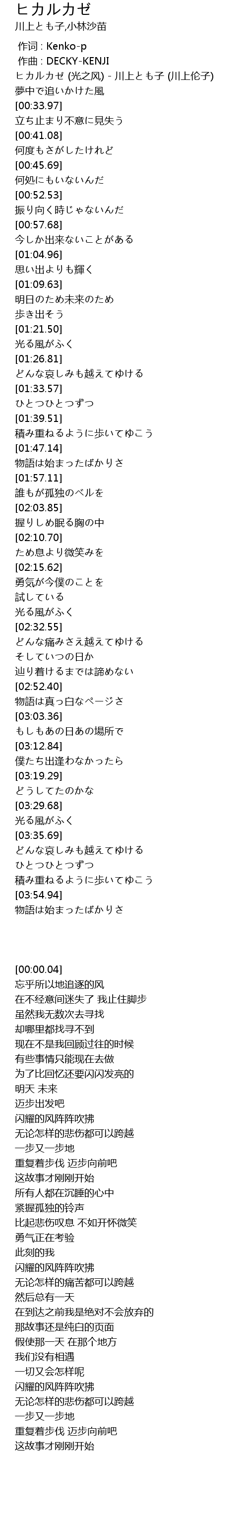 | [00:00.04] | ヒカルカゼ (光之风) - 川上とも子 (川上伦子) |