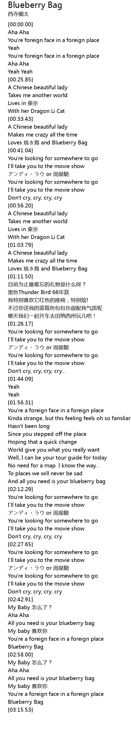 | [00:37.28] | Loves shāo niǎo and Blueberry Bag |