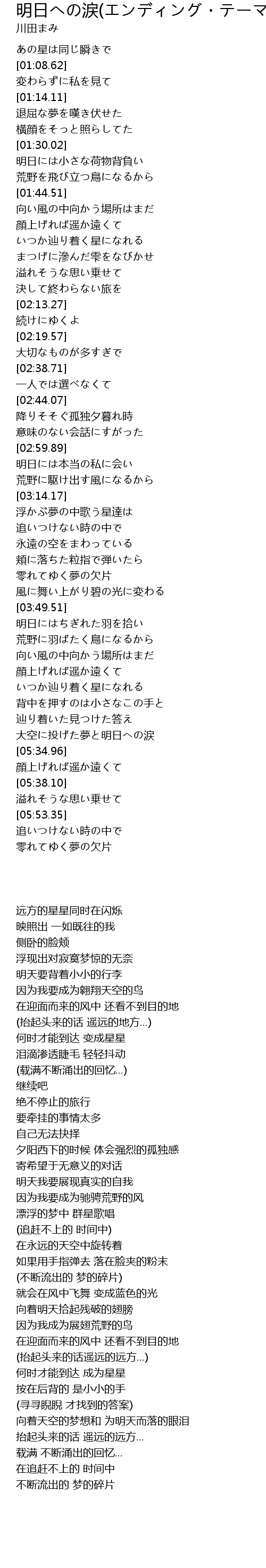 | [05:22.69] | 大空に投げた夢と明日への涙 |