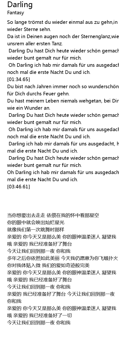 | [03:16.17] | Darling Du hast Dich heute wieder sch n gemacht, und Deine Augen wieder bunt gemalt nur fü r mich. |