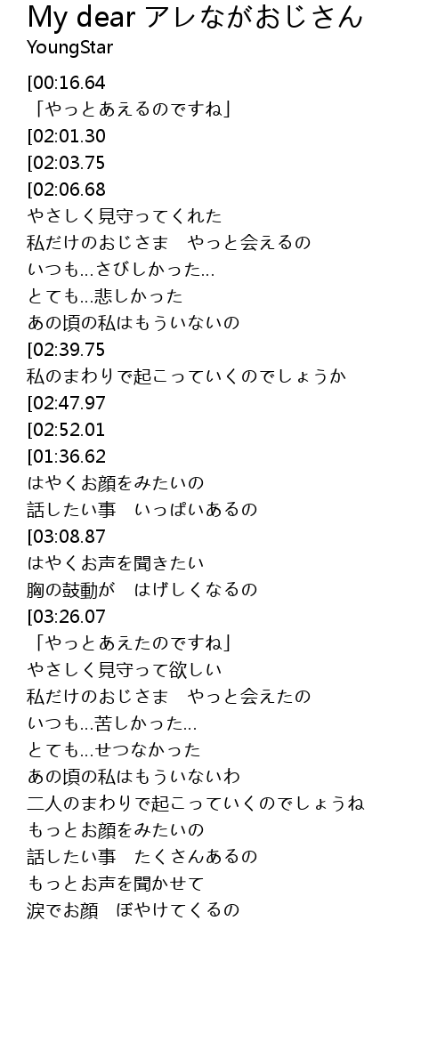 | [01:19.84][01:36.62][02:56.73][03:13.46] | 私だけのおじさま |