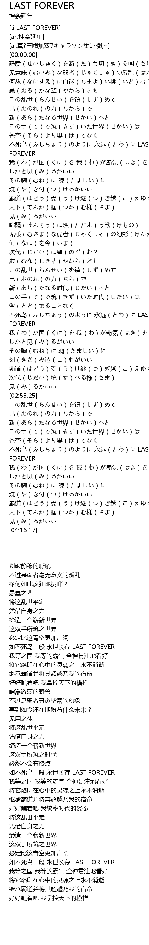 | [03:45.50] | 不死鸟(ふしちょう)のように 永远(とわ)に LAST FOREVER |