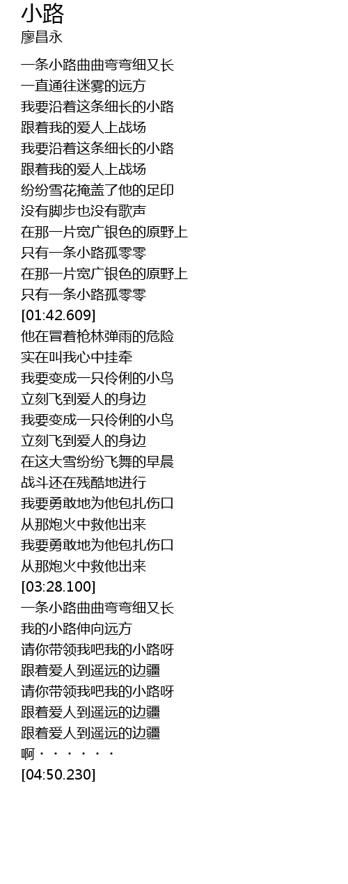 | [03:46.390] | 一条小路曲曲弯弯细又长 |