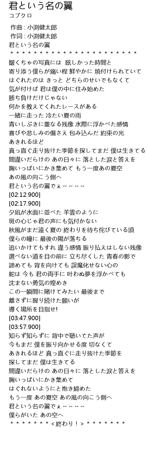 | [02:09.900] | 君という名の翼でぇ~~~~ |
