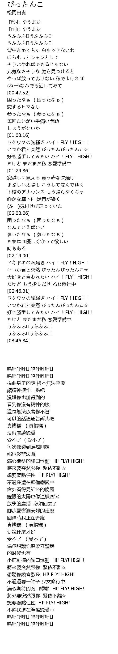 | [03:12.54] | 滿心期待的胸口悸動 HI! FLY! HIGH! |