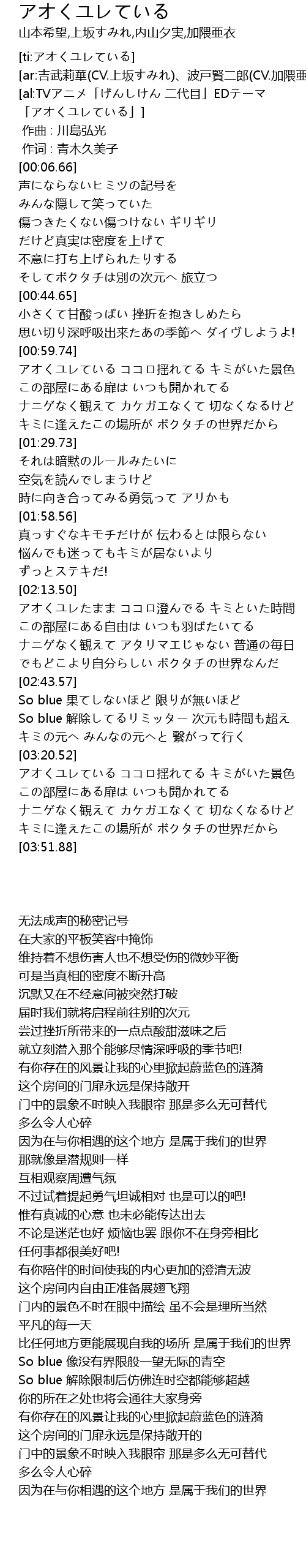 | [02:13.65] | アオくユレたまま ココロ澄んでる キミといた時間 |