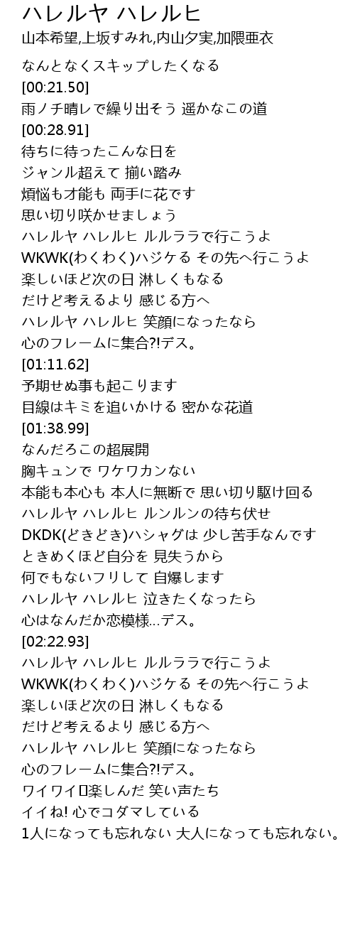 | [00:47.55] | ハレルヤ ハレルヒ ルルララで行こうよ |
