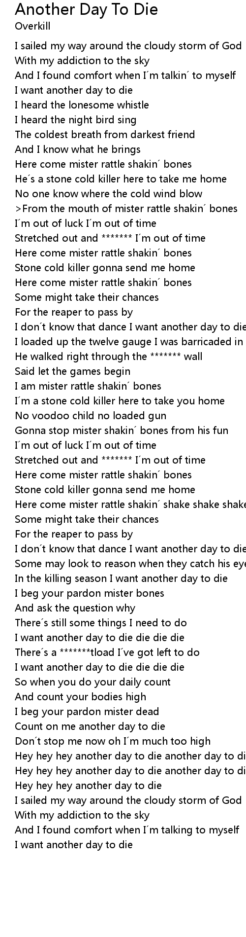 | Hey hey hey another day to die another day to die | |