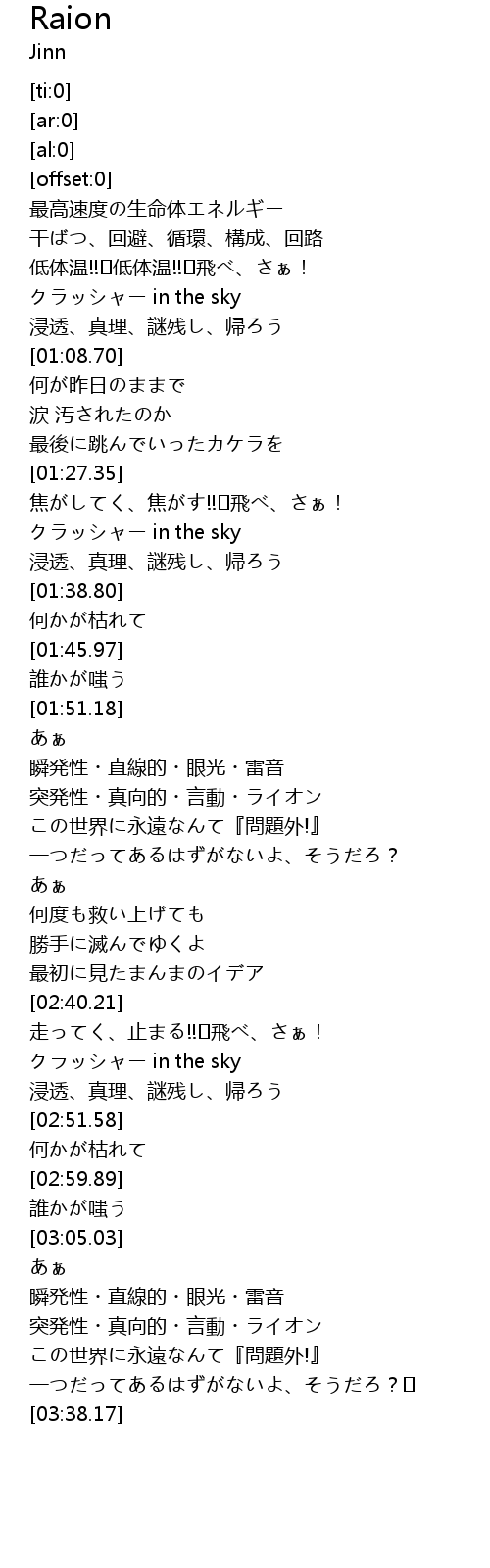 | [02:03.27] | 突発性・真向的・言動・ライオン |
