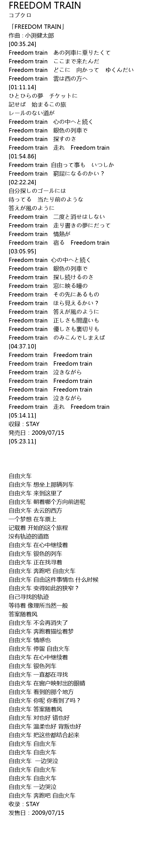 | [00:55.39] | Freedom train どこに 向かって ゆくんだい |