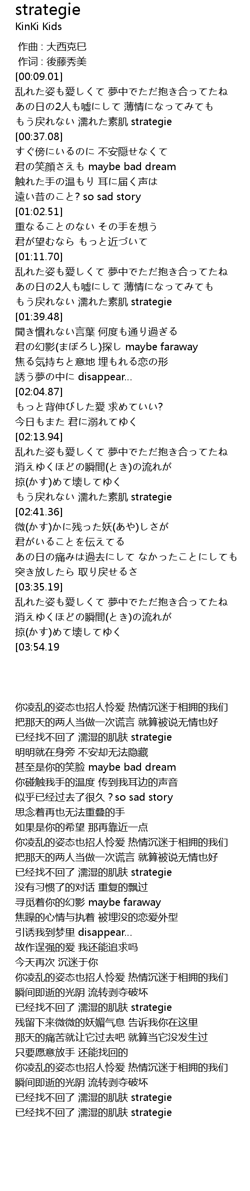 | [04:03.43][03:54.19] | もう戻れない 濡れた素肌 strategie |