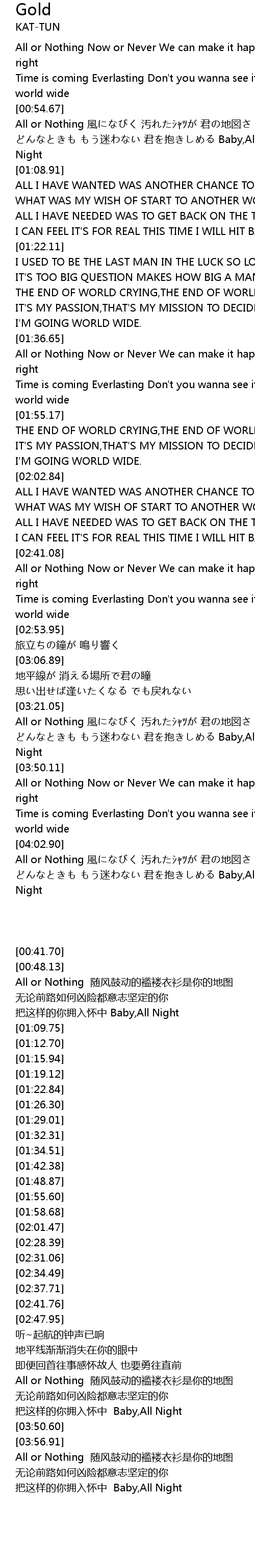 | [00:41.70] | All or Nothing Now or Never We can make it happen We can make it all right |