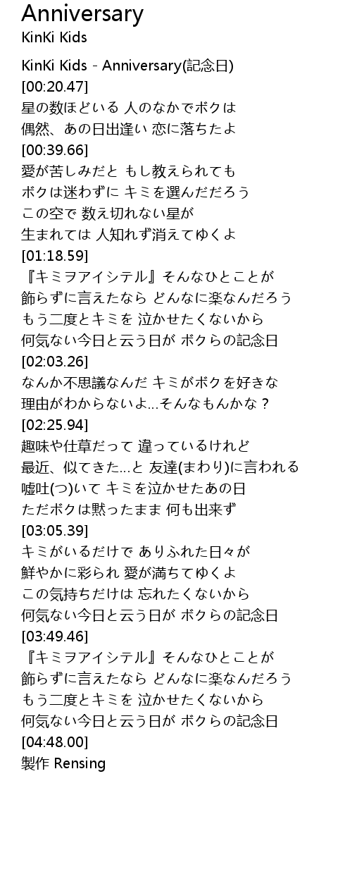 | [00:00.00] | KinKi Kids - Anniversary(記念日) |