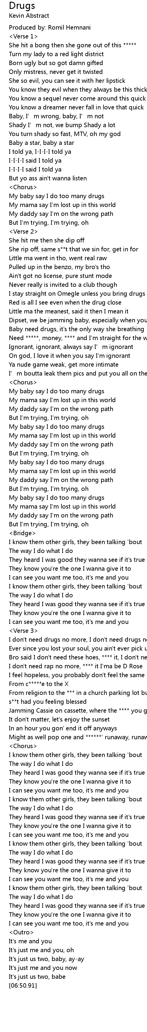 | [00:41.66] | My baby say I do too many drugs |