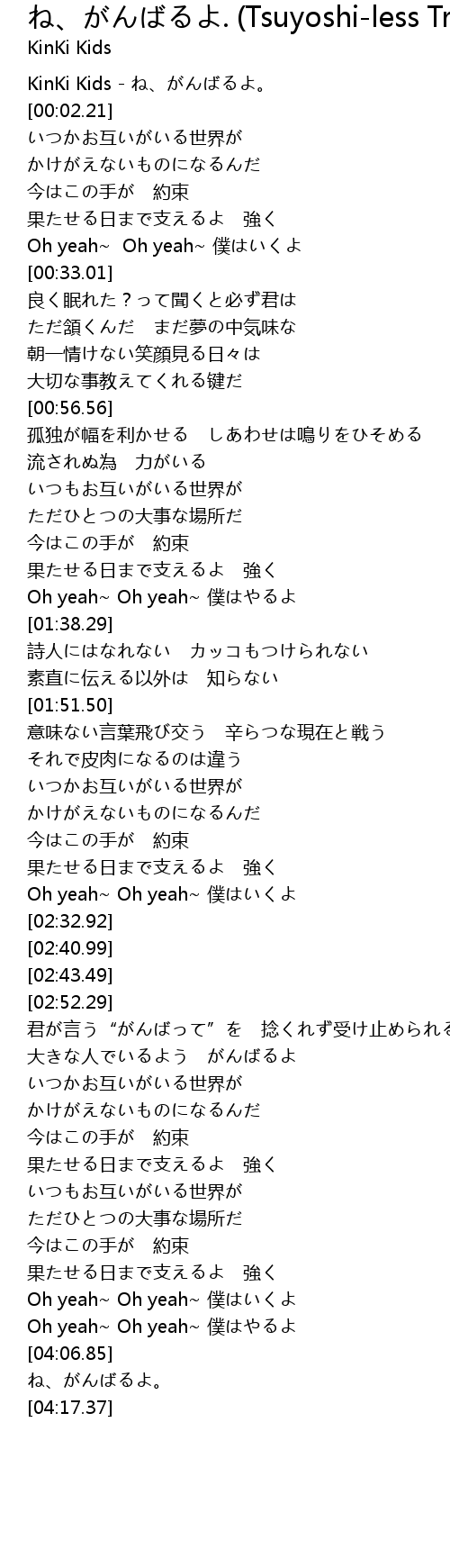 | [00:00.00] | KinKi Kids - ね、がんばるよ。 |