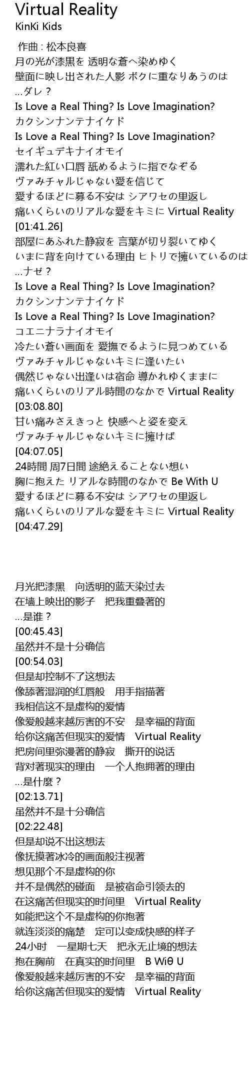 | [02:57.96] | 痛いくらいのリアル時間のなかで Virtual Reality |