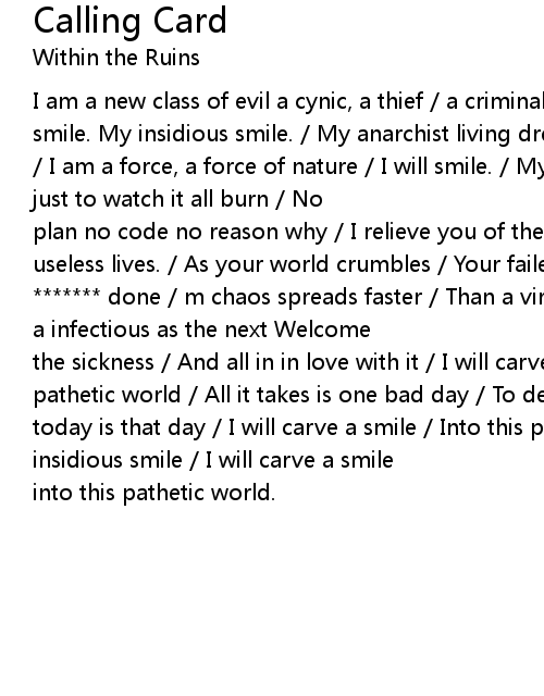 I am a new class of evil a cynic, a thief / a criminal with no sympathy / I will smile. My insidious smile. / My anarchist living dream / I am an agent of chaos / I am a force, a force of nature / I will smile. / My insidious smile / Live just to watch it all burn / No |