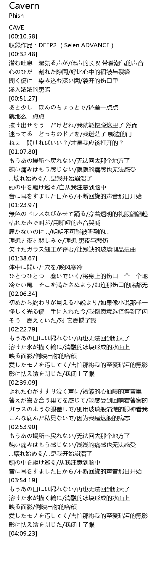 | [04:02.70] | 愛したモノを汚してく/害怕那将我的至爱玷污的黑影 |