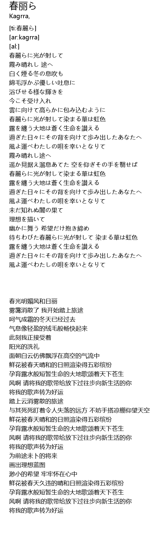 | [01:25.36] | 春麗らに光が射して染まる華は虹色 |