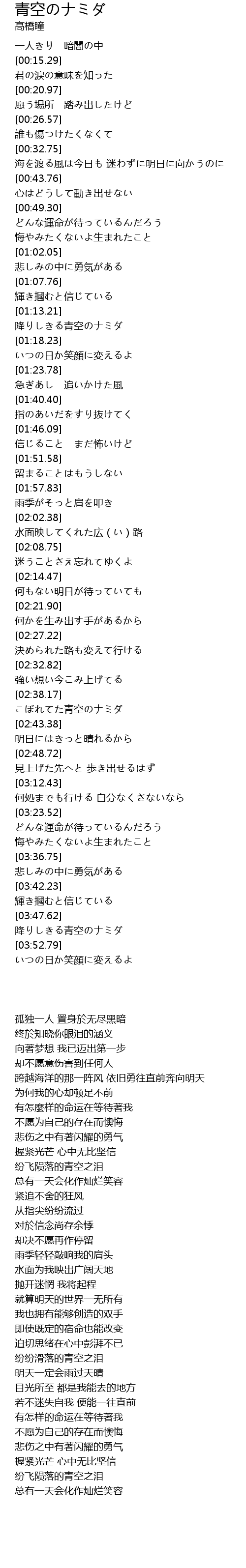 | [03:48.36] | 降りしきる青空のナミダ |