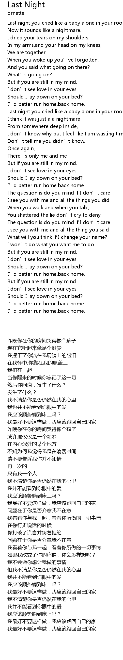 | [00:00:40] | 昨晚你在你的房间哭得像个孩子 |