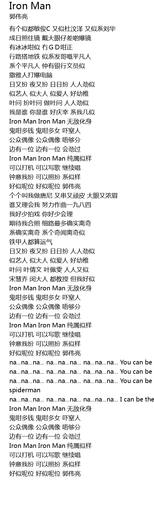 | [01:14.160] | Iron Man Iron Man chún shǔ shì yàng |