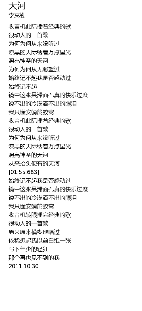 | [01:34.159] | cong lai tai tou bian you de tian he |